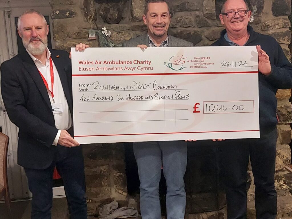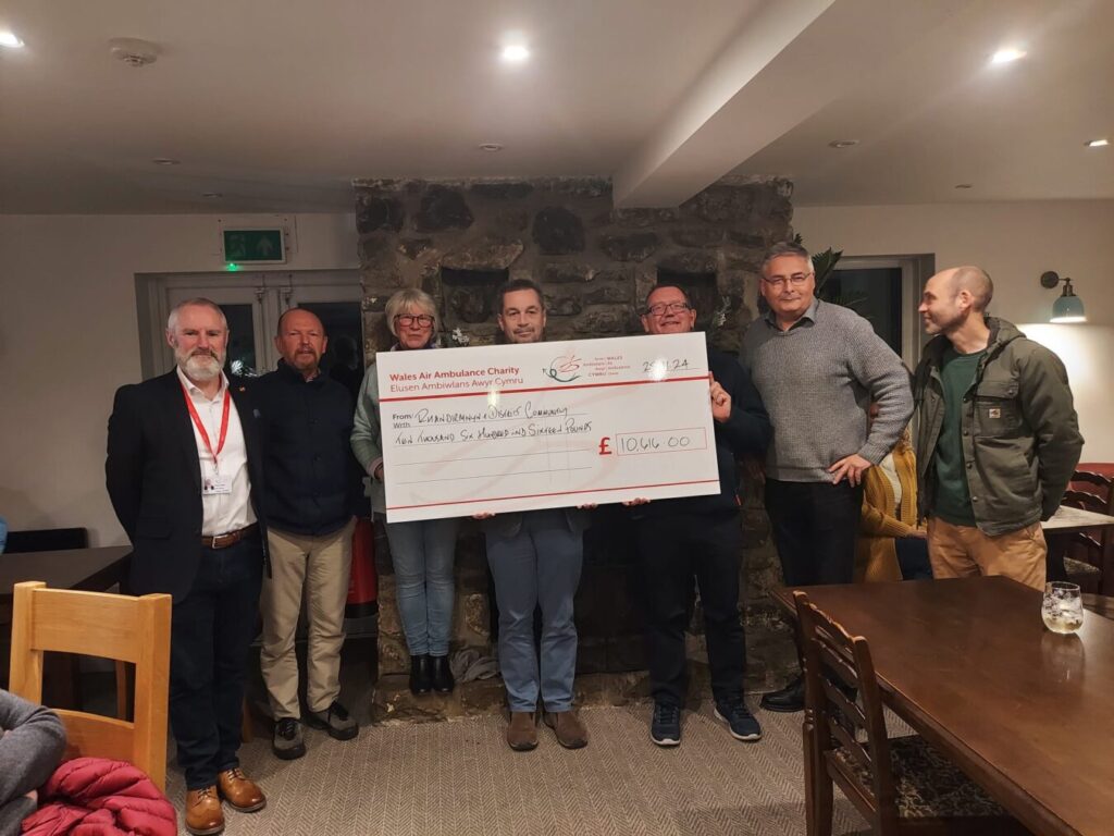 On 28 November 2024, before this year’s Rhandirmwyn & District Community Association’s annual general meeting, the funds raised by the RDCA through its recent “Auction of Promises” fundraising event were presented to the Air Ambulance charity.
